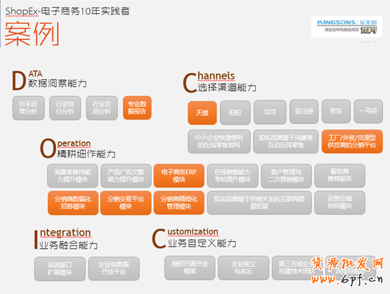 金圣斯在2010年開始專注網絡分銷,通過ShopEx分銷套件完成了從出口轉變為內銷的華麗轉身,多管齊下進行國內線上業務的多渠道建設。2年多以來,金圣斯發展了300家國內優質分銷商,多等級的分銷商管理機制令產品分配和品牌推廣更有效。借助分銷商的龐大力量,金圣斯日均分銷訂單保持在300單以上,由此迅速做到淘寶類目第一。