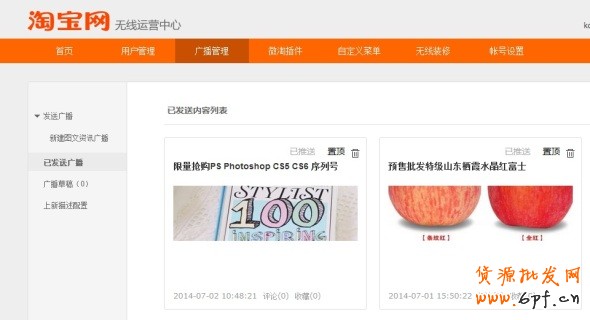 2丶小竅門:微淘廣播可以置頂哦,這樣活動就可以持續被關注呢。(1)進入淘寶無線運營中心,進入"廣播管理"