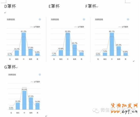 淘寶“商品大爆炸”小組針對內衣數據進行分析,將罩杯從A到F的女性,按照淘寶設定的低、偏低、中、偏高、高的五檔消費能力分類,發現A罩杯的女生消費能力位于平均水平,從B罩杯開始,罩杯越大,高消費人群占比越來越多,偏低消費的人數占比則越少。以偏低和偏高、高三檔為例,從B——F罩杯,偏低消費群分別占比64.9%,21.1%、14.1%、12.8%、7.6%。而在偏高消費群,其占比則分別為7.0%、12.1%、17.9%、26.7%、24.5%,在高消費群體,其占比則為0、4.5%、5.9%、7.1%、6.9%,值得注意的是,在B罩杯的消費群體中,其中9成以上都處于中低的消費水平。而G罩杯的姑娘中,8成以上都處于中高消費水平。