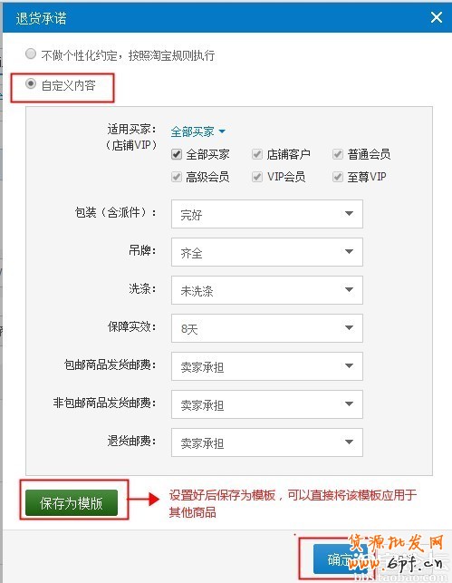 (4)點擊“自定義內容”后根據約定內容設置,設定好之后可以將其保存為模板,給其他商品直接做同樣的配置。