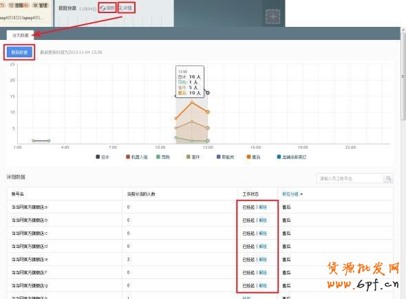 小編提醒:設置完畢不要忘記點“保存”。此時千牛PC的桌面端會出現分流的面板:點擊“詳情”,會彈出詳細信息的面板,現在主管(主賬號)就可以查看不同分流分組、分流子賬號的實時接待量數據;主管(主賬號)在詳細數據中找到對應的子賬號,可執行“掛起/解掛”的操作;