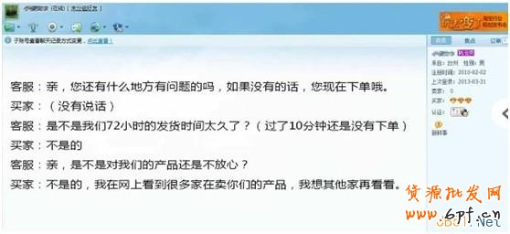 2、我想貨比三家 不管客戶是真的拒絕還是假的拒絕,客戶不可能馬上就改變主意。如果客服指導競爭對手價格更高,也不能馬上告訴買家,讓買家匆忙做出決定。因為這樣如果后續商品有問題,買家會認為是我們逼迫下買的,會把責任推向客服。而且買家有可能只是短暫離開,如果我們還是纏著不放,會讓買家產生抵觸心理。我們一定要和買家保持良好的關系,即使這次做不成生意,但也許下次他會主動找到你。我們再來看一個案例: