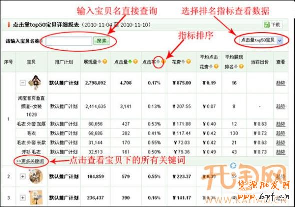 在“Top50寶貝詳細報表”中,您可以看到按不同數據指標排行的TOP50寶貝詳細數據,包括點擊量top50寶貝、展現量top50寶貝、點擊量為0寶貝等數據,還可以輸入寶貝名進行相應寶貝的數據查詢。