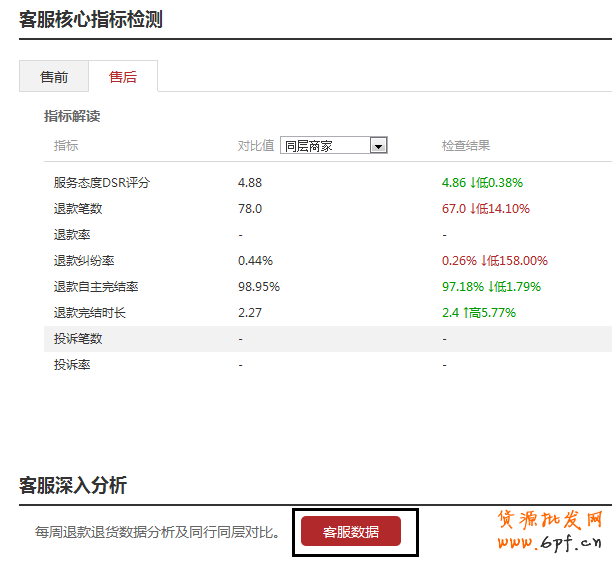 如圖,可以看到這個店鋪現在領先6%的同行商家,所以它的售后綜合指標得分就是1-6%=94%。一般來說,領先同行商家越多,售后綜合指標得分就越低。領先的同行賣家越多越好,也就是說,售后綜合指標得分越低越好。目前淘寶最最最底線,報名天貓官方活動的最低要求,是售后綜合指標得分小于等于90%,即我們要領先10%以上的同行商家。