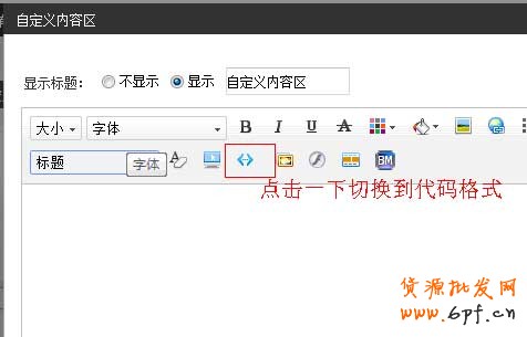 第四步,將復制的代碼,黏貼到剛才的“自定義區域”,然后再點擊一下“代碼圖標”,可以先看看效果,然后點擊“確定”。
