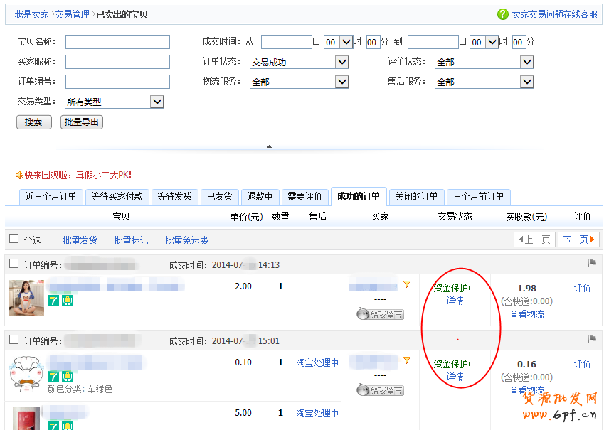 買家確認收貨之后,在賣家的“成功的訂單”里,資金的交易狀態是“資金保護中”