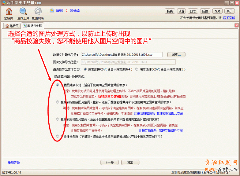 如果是淘寶店鋪建議大家選擇導出淘寶數據包,然后進行下一步,進入下一步,只需簡單幾步就可以處理:“您不能使用他人圖片空間中的圖片”的錯誤了。