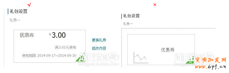 ① 新人禮包必須設置3張禮券,可選類型包括優惠券、包郵券,禮券類型可重復,3張禮券任意搭配。注意,天貓賣家只有優惠券沒有包郵券,集市賣家兩者都有。