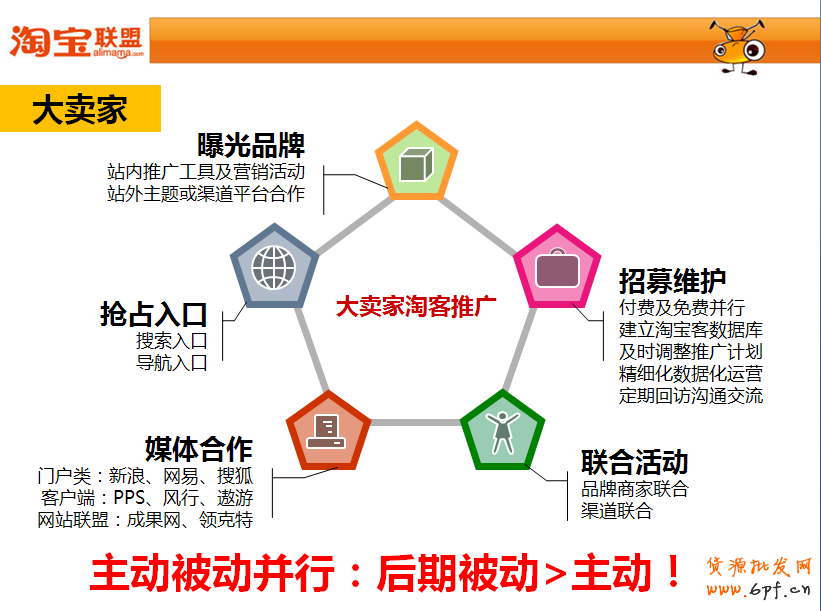 大賣家的操作方式上要做到比較全面。因為整體的效果到后期會被動流量比主動流量大。但前期的投放費用可能會比前面2種賣家多。但,相應的大賣家們每年每個月都會有自己的一個站外的固定推廣費用,所以效果是顯而易見的。最主要的分為五個:1丶曝光皮牌2丶起那個站入口3丶媒體合作4丶聯合活動5丶招募維護。針對于一些核心項也已經在PPT上呈現給大家。