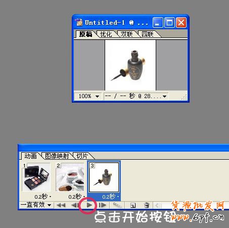 第五步:要做動畫了,點擊指定的工具,跳轉到做動畫的ImageReady軟件里。如圖: