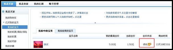 1、在“競拍中的寶貝”選項查看進行中的拍賣商品您的出價狀態。