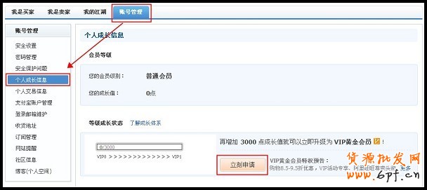 您可以進入“我的淘寶”—“賬號管理”—“個人成長信息”頁面查看成長值,如果您的成長值已經達到黃金會員的要求,您就可以點擊“立刻申請”進行提交了(點此查看如何提高成長值)。