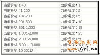 3、系統代理加價幅度:指系統根據當前的出價金額自動限定加價幅度的方法。系統自動代理加價幅度表如下: