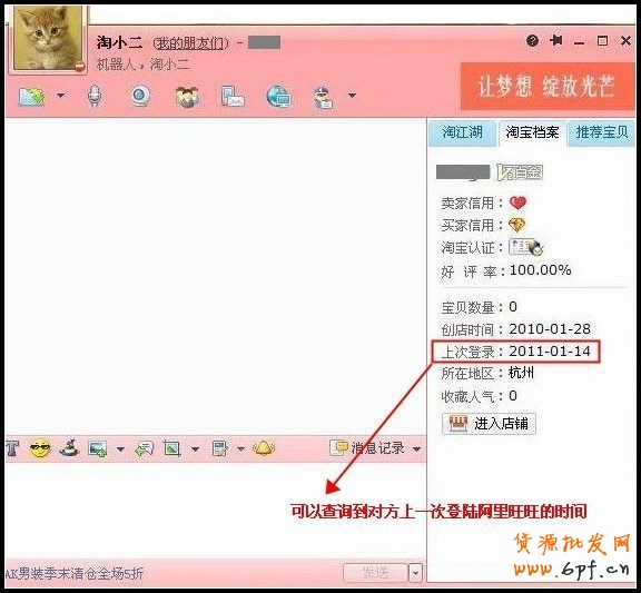 如果是想知道他人近期是否使用過旺旺,可以在聊天框右側“淘寶檔案”中進行查詢