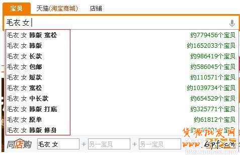 例如我們搜索我們產品詞 “毛衣 女” 下拉有韓版 寬松 包郵 長款 中長款 打底 原單 修身。。。并且后面有各關鍵詞大約有多少寶貝數量,根據寶貝本身有事添加相對競爭優勢的關鍵詞。這些詞都是經常被買家搜索的。
