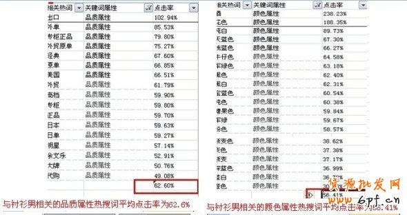 關鍵詞分為廣泛詞與冷門詞,涉及多個屬性,有品牌、品質、顏色、款式、細節、特定人群人類、場合、風格、面料屬性等??聪履膫€屬性的點擊率更高。以“襯衫男”這關鍵詞為例,提取與它相關的前500個關聯熱詞(根據數據魔方)