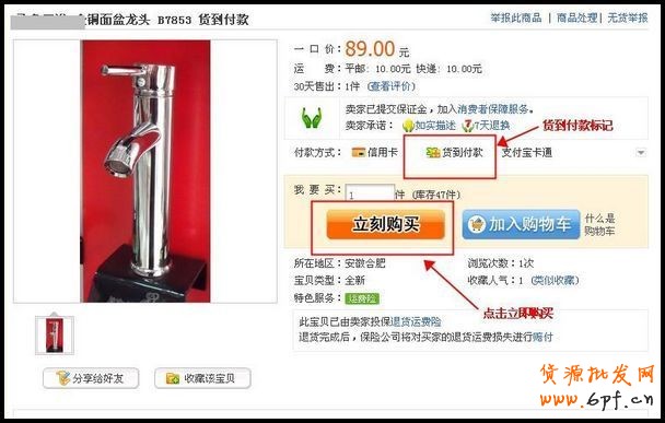 第二步:找到心儀的有貨到付款標記的寶貝后,點擊立刻購買。