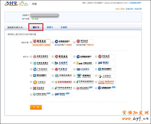 4、選擇網上銀行或卡通,并點擊“下一步”,到相應的網上銀行操作成功,對方賬戶即可收到充值金額;