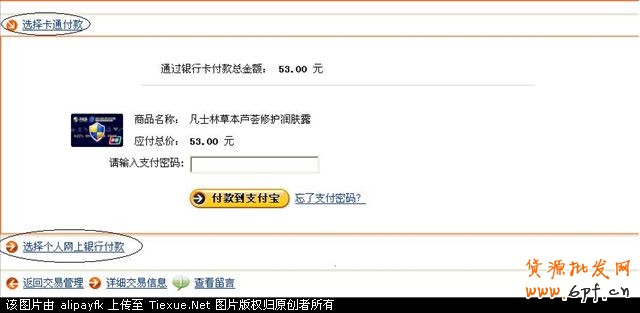 我選擇“付款到支付寶”,輸入支付寶支付密碼。這時,你可以看到,53元中的31.67已通過支付寶余額支付掉了,剩下的21.33你可以選擇卡通付款或者是用網上銀行支付。