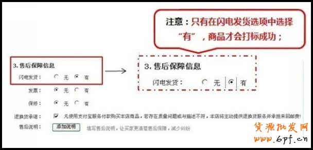 2)然后您在寶貝發布頁面,找到“(3)售后保障信息” 第一欄“閃電發貨”選項,有“無”和“有”兩個選項,請選擇“有”,當所有寶貝信息填寫完整,點擊發布就可以了哦。