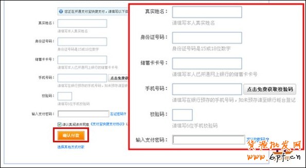 2、需要用戶填寫真實姓名、身份證號碼、儲蓄卡卡號、填寫在銀行預存的手機號碼并輸入校驗碼、支付密碼,閱讀協議,點擊“確認付款”,提示成功并開通儲蓄卡快捷支付。