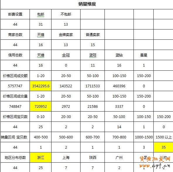 大多數消費者希望購買的產品低價而優質,特別是首次面市的品牌。我們經過了細致的數據分析,基本思路如下:通過兩個維度的分析,從綜合搜索和銷量搜索入手,對淘寶搜索中第一頁的產品進行分析,大致得出產品市場競爭情況。從這45個坑位中我們需要得到如下參數,店鋪的屬性(B/C),地區分布,信用,郵費,價格,折扣,銷量區間寶貝數,價格區間成交額,價格區間成交量。以獼猴桃為例,如下表: