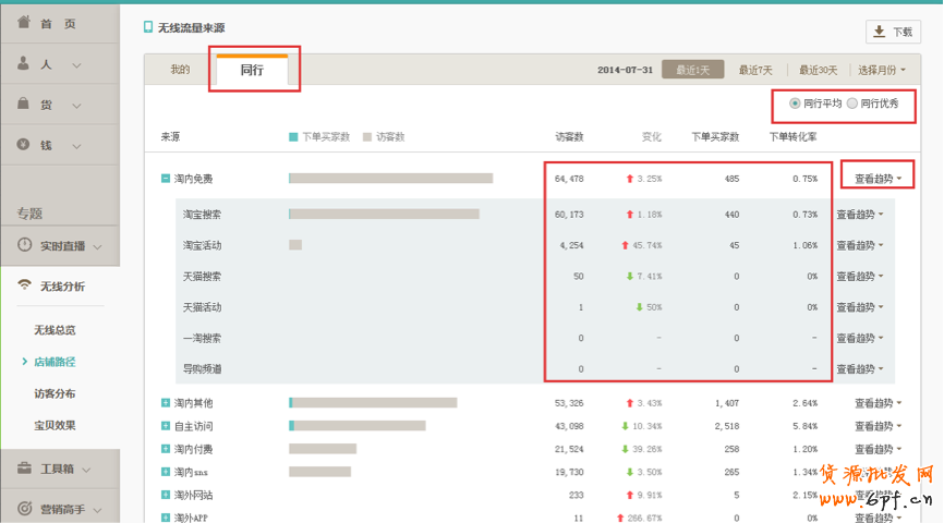 1)無線流量來源主要提供我的無線流量來源效果數據及趨勢,并提供同行平均,同行優秀數據進行對比: