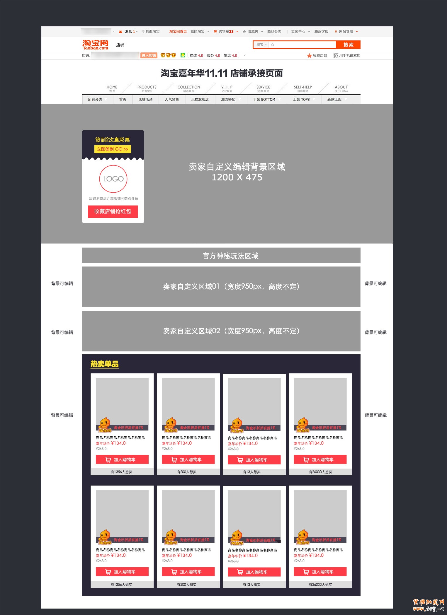 頁面出現位置:店鋪導航“首頁”邊上,包含內容:1、簽到送彩票2、收藏送紅包3、大促商品4、淘金幣抵價