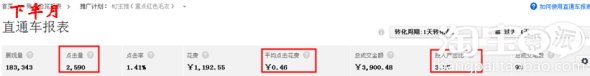 下圖,是我們近一個月的直通車推廣報表,下半月與及上半個月對比,在保證點擊量的情況下,我們CPC不僅降低了,ROI也足足翻了一倍。接下來,就和大家分享一下,如何通過直通車關鍵詞數據分析合理優化關鍵詞,從而達到降低CPC和提升ROI的目標呢?