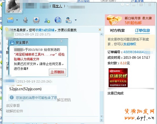 這是當初我為了幫襯,花了0.1拍了她的寶貝,結果她直接發帶木馬病毒的軟件過來,因為我自己是學計算機的,安全意識比較強,未打開,隨手就刪除了,并未造成任何損失,但當時并沒有引起我的警惕。現在想起來,如果其他人購買了她的裝修,點擊了她的木馬,那損失不就大了?所以對任何人發過來的可疑文件,無需運行,直接刪除。