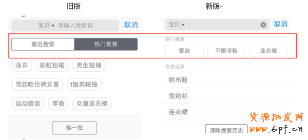 4.搜索框默認狀態將“最近搜索”和“熱門推薦”合并了,推薦的關鍵詞減少了。