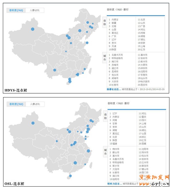 由以上淘寶指數提供的數據,可以分析出,HDYS連衣裙和OSL連衣裙的地域人群喜好程度。HDYS的集中于東北部和沿海地區;而OSL的主要集中于東北部地區,沿海地區相對少一點。當然造成這種差異出現的原因,歸根于兩大品牌的不同定位上,這里不多做分析。