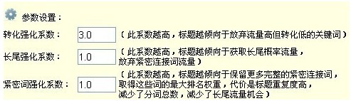 當然,其中還可以參照三個調節參數,轉化強化系數越高,標題越傾向于放棄流量高但轉化低的關鍵詞,長尾強化系數越高,標題越傾向于獲取長尾概率流量,放棄緊密連接詞流量,緊密詞強化系數越高,標題傾向于保留更多完整的緊密連接詞。
