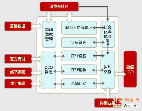 企業要開發微信CRM,首先要從業務架構上進行設計清楚。微信CRM的本質,是在微信渠道上利用微信的特點和接口而擴展的CRM系統。而CRM系統,一般可以分為五大模塊:客戶、銷售、營銷、服務、會員,另外還有一些附屬模塊:產品、知識庫、活動、交易、統計報表等。在確定微信CRM的業務架構后就可以進一步設計具體的數據模型、功能模塊和接口對接了。