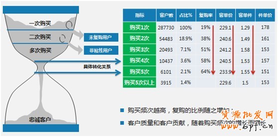 很多商家的銷售額每年翻倍增長,而利潤卻在成倍的下降,而這恰恰是很多賣家在看數據的時候會忽略的,老板更關心賣了多少,卻很少關心老客戶有多少,有價值的客戶到底有多少。通過數據漏斗,可以抓取出店鋪的忠誠客戶,看到購買一次的客戶、購買兩次以及五次以上的用戶是多少,平均購買一次的客戶單價在多少,購買了五次的又是多少。
