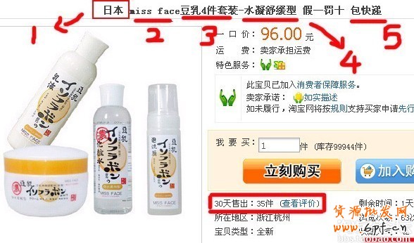 且不說這個寶貝的標題優化程度如何,只說傳統意義上的關鍵詞,這個標題中就有月朗,寶薇,正品,品牌,修身,女褲,加厚,夾棉,棉褲,冬季保暖,羽絨褲,2011,女裝,005(貨號)一共14個關鍵詞,其中有商家名關鍵詞一個,品牌關鍵詞一個,屬性關鍵詞7個,品名關鍵詞2個,類目關鍵詞2個。細心的掌柜可能發現了,30個關鍵詞的位置卻放了32個關鍵字,這就是“正品牌”“夾棉褲”這兩個關鍵詞的妙處了。每一個關鍵詞都可以當成兩個關鍵詞使用,這些都是在日常的關鍵詞使用中發現的小技巧,當然類似的關鍵詞還有很多,例如“女褲子”“加大碼”“秋冬季”“新品牌”等等,這些需要大家根據自己的商品屬性座椅合理的使用了。在這里簡單的說兩句,寶貝的標題一般上應該注意應該包括商家商品名,商品屬性描述關鍵詞,商品名關鍵詞,有些品牌商品還需要加上貨號。幾個關鍵詞盡量能組成一句較為通順的話,前提是不影響關鍵詞的設置,這樣的話一方面會顯得比較整齊正規上檔次,另一方也能夠充分的符合用戶的搜索習慣,盡量匹配用戶搜索結果,切忌為了達到高的展現量胡亂的加上熱搜關鍵詞,這樣的話一方面淘寶會根據自己的規則對濫用關鍵詞的商品給予違規警告,另一方面也會影響展現的跳轉率,因為你答非所問,即使有了高的展現,不是用戶希望的商品,也不可能會促成交易的。