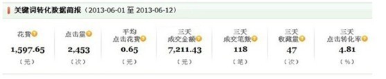 加完所有的詞后,質量分只有平均8分左右,并不理想。然后再加其他一些不精準的詞,每個小時加0.08元。直到開始有流量,就開始看關鍵詞的排位,看看點擊率高的詞。如果點擊率高,試著沖一下點擊量,這對我直通車的整體非常有利。每個小時給這個詞加0.1元,直到點擊詞燒到了20個點擊。這時停止加價。觀看明天數據。第二天還是要繼續養詞。很多男裝的詞加到5塊錢都沒有點擊的,這個情況是開始階段。
