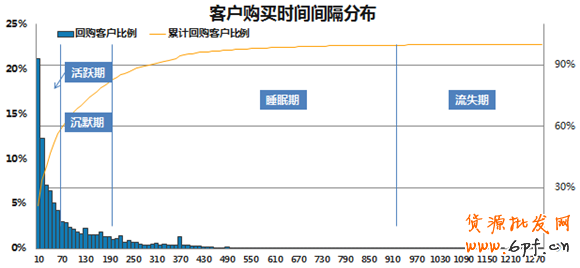 首先Y做的事是對自己的客戶摸個底,了解到客戶購買的規律。根據客戶回購的周期,將客戶劃分為四種狀態,分別為“活躍期、沉默期、睡眠期、流失期”。由于知道了客戶會多久回來購買,那么就可以在恰當的時間點上做營銷信息推送,提高品牌店鋪印象,增加交易機會。