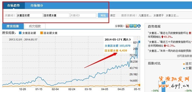 如下圖,我們返回淘寶指數的首頁,把這兩個關鍵詞分別輸入進行對比,我們發現2014新款女童夏裝比童裝 女夏裝2014的搜索指數要高5000多點,可能大家覺得,那我就選搜索指數高的把,大家別再著急,我們的目的是要找出性價比最高的對應關鍵詞,下一步才是關鍵!