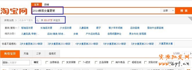 記住這兩個關鍵詞,然后我們打開淘寶網首頁如下圖,我將這兩個關鍵詞分別的在淘寶搜索頁面搜索了一下,我們要查的是什么呢?查的是輸入這兩個關鍵詞后所出現的寶貝數量!第一個關鍵詞:2014新款女童夏裝 搜索后出現了 85.07萬的寶貝,而第二個關鍵詞:童裝 女夏裝2014 搜索后出現了109萬個寶貝,上面我們已經測試過這兩個寶貝的搜索指數,2014新款女童夏裝 要比后者的搜索指數要高出5000點,但競爭的寶貝數量卻比后者少出將近20多萬個寶貝數量,顯然2014新款女童夏裝 這個關鍵詞的性價比是最高的,那我們就把這個詞當作前綴關鍵詞留著吧!