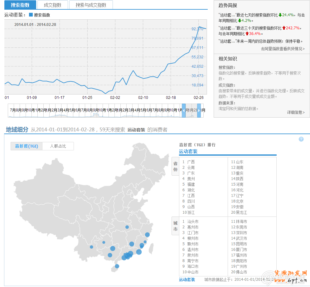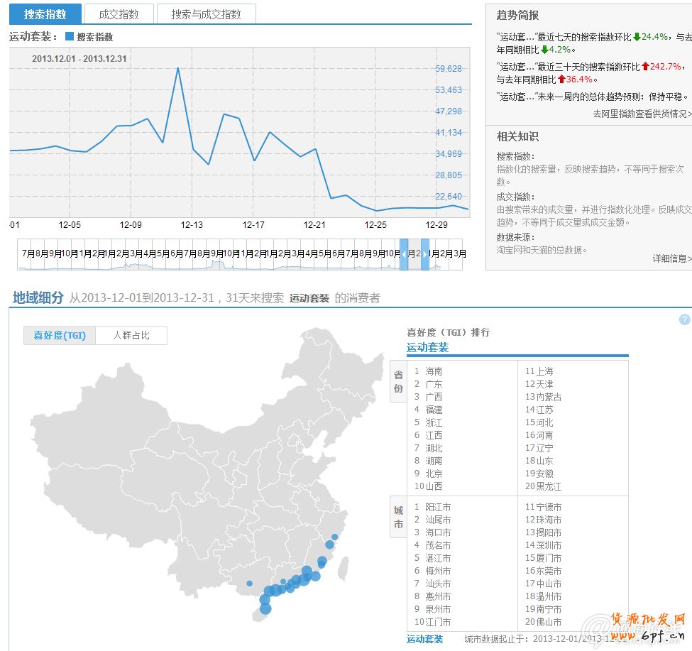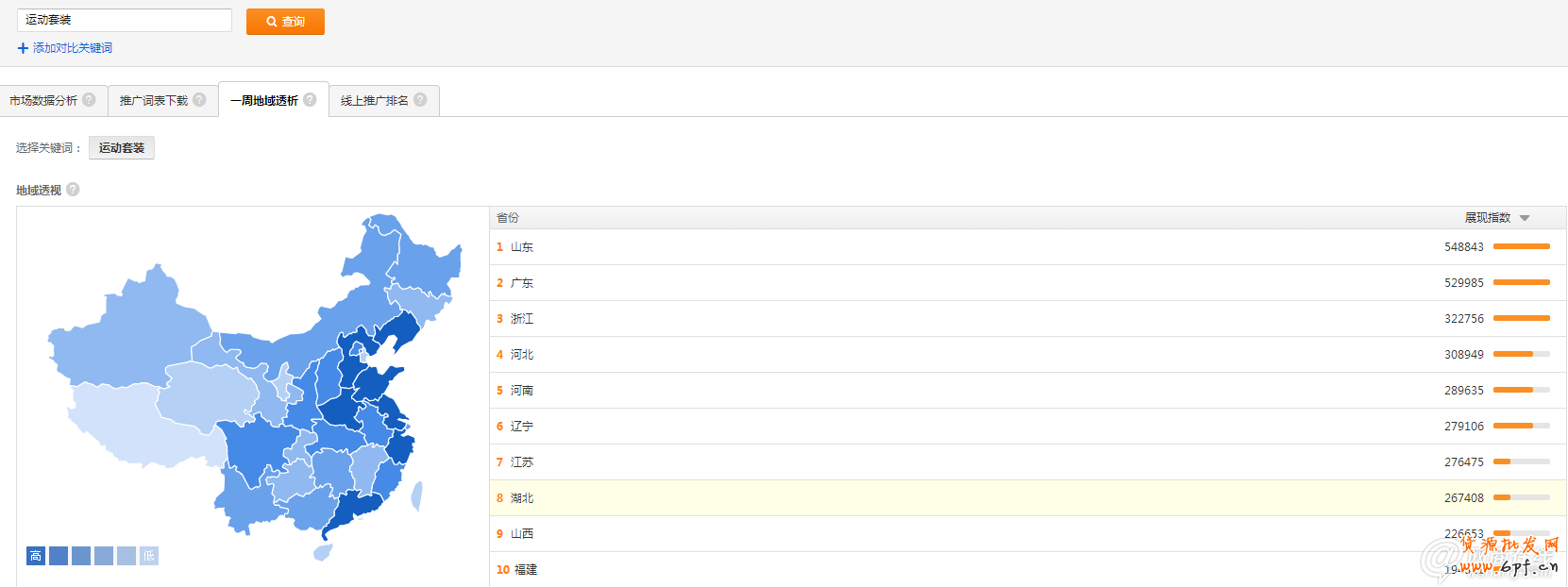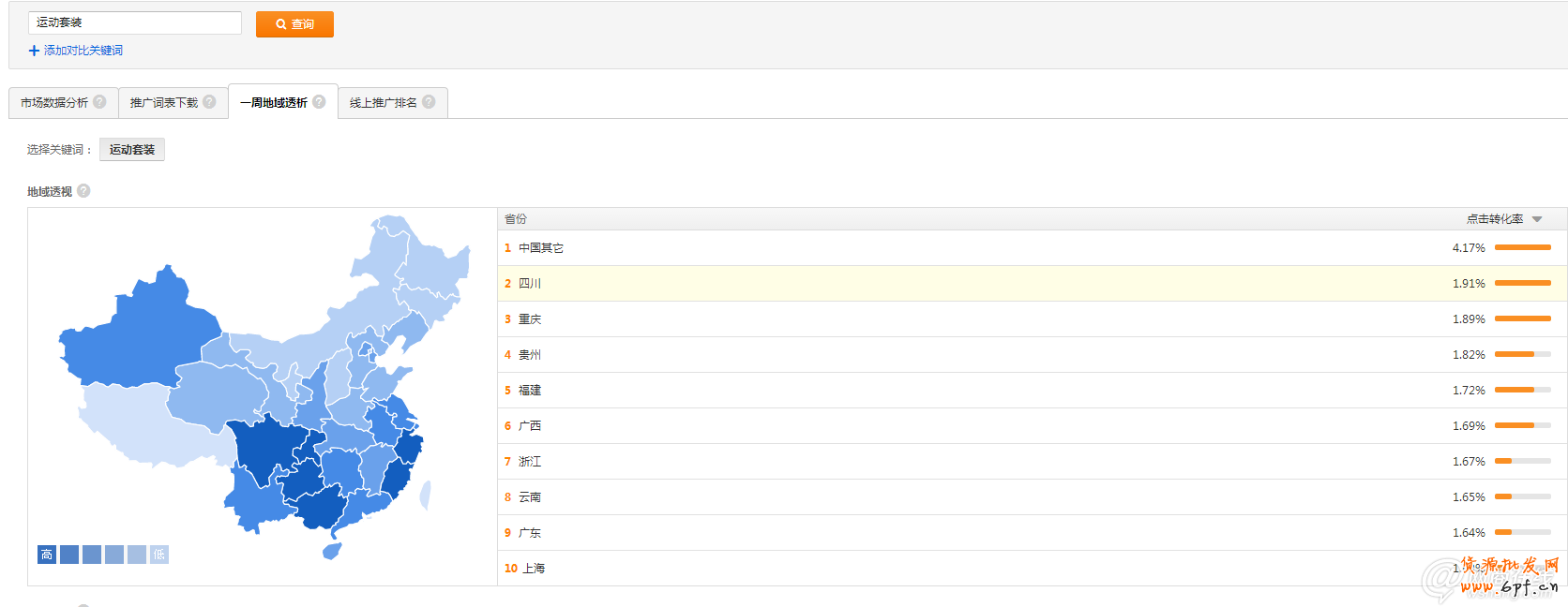 以上數據表圖粗略可以得出,四川省的點擊率及點擊指數為所有省份最高,同時,展現人數在此關鍵字下具有一定的比重。PS:關鍵字的展現,點擊,點擊轉化需要有一定的量,才可以具備參考的意義,具體的量級可以根據不同類目的流量情況進行差別。