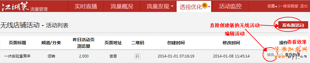 好,我們回到已經創建了無線店鋪活動的情況(如下圖)