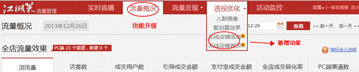 目前無線淘寶累積訪問用戶突破3 億,無線淘寶賣家數達355萬,無線店鋪的經營已經成為越來越重要的工作。為此,江湖策率先推出“無線端渠道透視”評估無線渠道流量及轉化效果。而本周我們給大家帶來了更為強勁的“無線店鋪首頁/活動數據透視+操作”功能,有圖有真相。