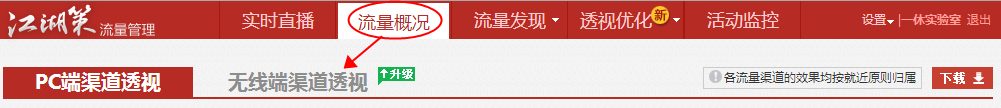 操作路徑:登錄江湖策后臺,訪問“流量概況”——點擊“無線端渠道透視”,如圖所示。