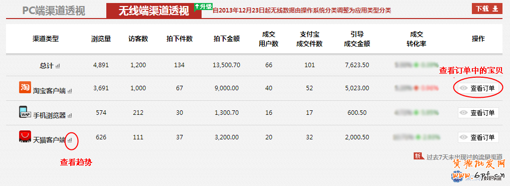無線端渠道透視——按淘寶APP、天貓APP、手機瀏覽器細分流量及轉化效果;