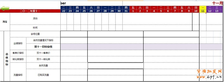 整個雙十一營銷計劃表單由多個信息維度組成,營銷計劃表是一個二維表,以時間為橫軸,關鍵維度為縱軸。其原理是以時間控制為核心來確定雙十一關鍵指標能按時按量的完成。