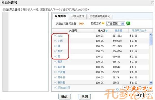 注意事項:很多新加入直通車的掌柜直接將系統推薦的200個關鍵詞全部添加,其實 系統推薦關鍵詞并非全部適合推廣。如:下圖選中的這些關鍵詞都比較寬泛,不推薦單獨做為關鍵詞使用,但是可以組合使用如:“2012 真皮休閑鞋”。