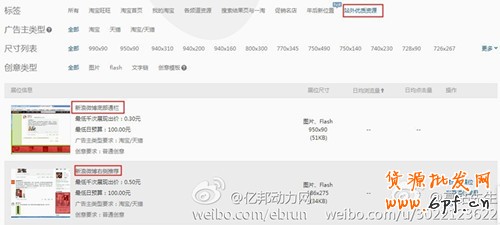 “新浪微博在鉆展后臺展位超市中,增加了‘站外優質資源’選項,在新浪微博中可直接推廣相關淘寶店鋪。” 據業內人士透露,在價格上,新浪微博底部通欄,最低千次展現出價0.3元,最低日預算100元;新浪微博右側推薦,最低千次展現出價0.5元,最低日預算100元。