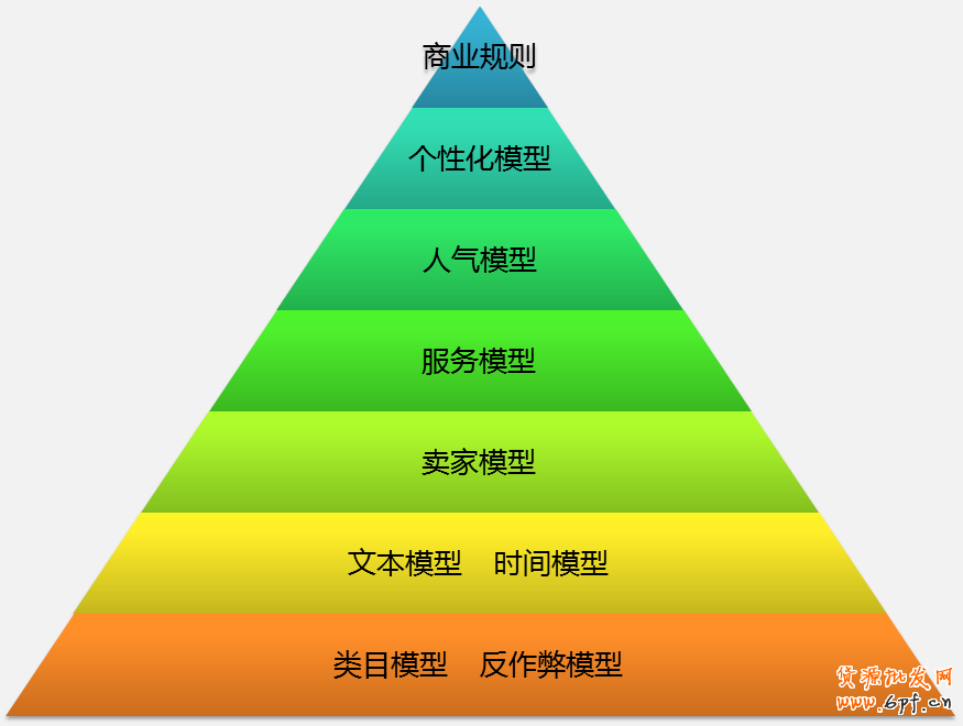 下圖是淘寶金字塔搜索模型結構,金字塔模型由下往上逐層過濾(擇優留用),能到達金字塔最頂端的商家&商品才會最終推薦給消費者。
