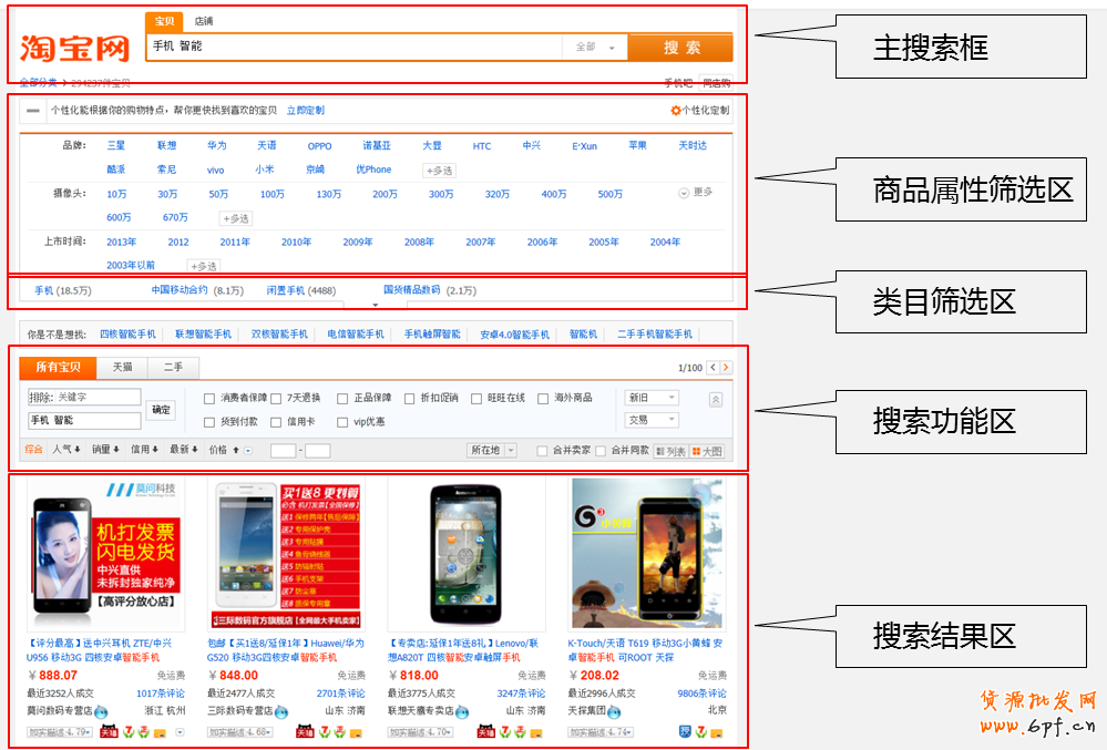 D.搜索功能區:用戶進行精準搜索的多功能搜索篩選區,包括“搜索市場TAB選擇”“商品特征篩選”“單一維度排序”“價格熱度展示”以及“個性化引導提示”